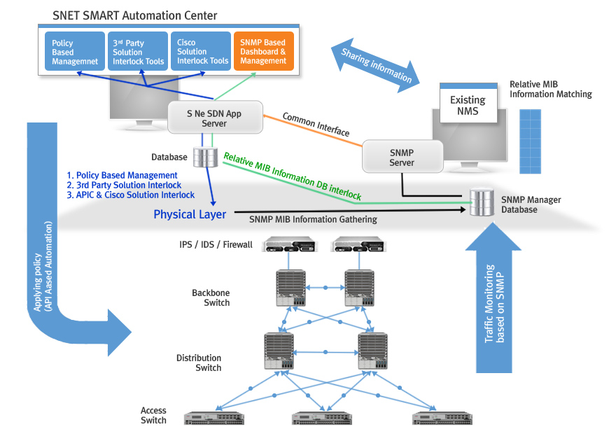 SNETSYSTEM is linked to not only Hardware but also virtualization software, server through SDN application development connected with Cisco solutions. It provides infra insight required for data center managing and also offer automated infra environment by interlocking with virtualization Software, Server and so on